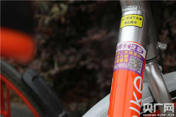 央廣網記者觀察到,這些小廣告的內容多集中于二手房交易、租房售房、資金貸款、駕照收分等!芭Fぐ_”形狀大小不一,大多貼在車架前方,十分顯眼。由于粘性過大,記者幾次嘗試將其揭開,均以失敗告終。