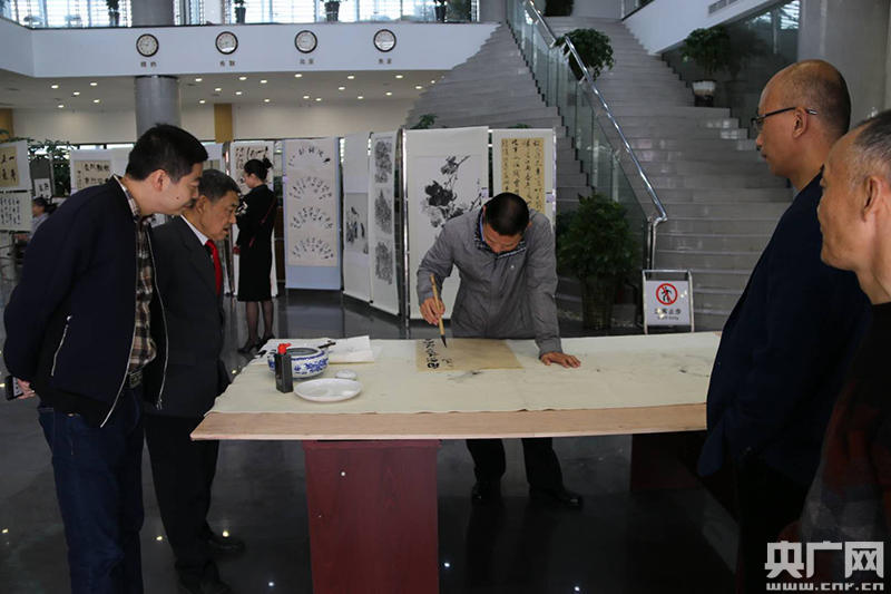 作為此次年齡最大的參展作者,今年82歲高齡的胡慶和喜愛書畫已經(jīng)有20年時間,他現(xiàn)場書寫了一幅“厚德載物”的隸書作品。胡慶和認(rèn)為家鄉(xiāng)青神起了翻天覆地的變化,社會風(fēng)清氣正,生活美好心情舒暢,正是“勤、廉、德”的體現(xiàn)。