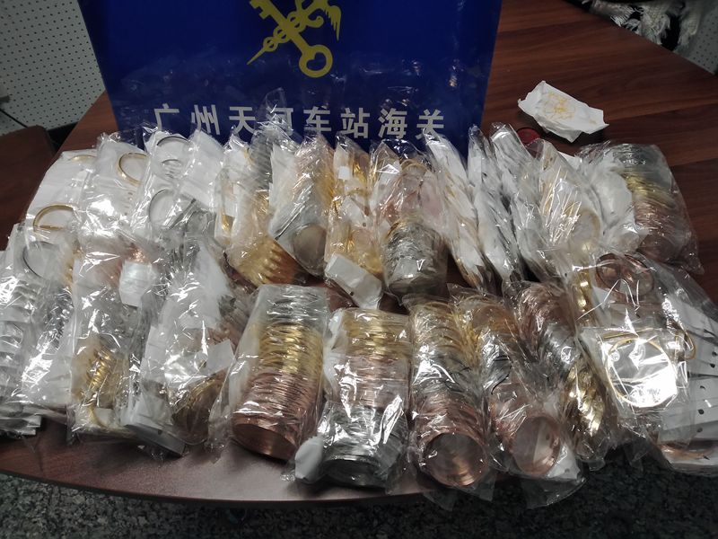 11月25日上午,天河車站海關關員在一名出境旅客隨身行李中查獲未向海關申報的“Cattier”、“Hermes”、“Chanel”、“Gucci”等知名品牌的手鐲,這批手鐲做工低劣,包裝簡陋,共計482件,涉嫌侵犯卡地亞、愛馬仕、香奈兒、古馳等8個知名品牌的知識產權。據當事人稱,該批手鐲總價僅3800元,無法提供相關知識產權證明。