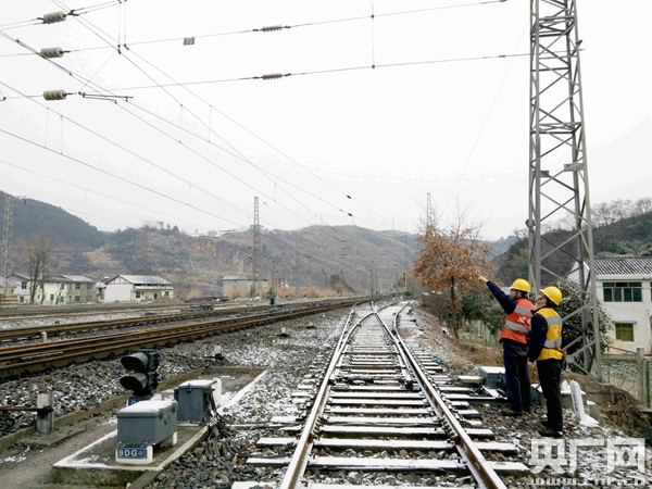 1月27日,成都供電段組織干部職工對(duì)此次降雪受影響區(qū)段接觸網(wǎng)關(guān)鍵設(shè)備進(jìn)行巡視。(李煒 攝)