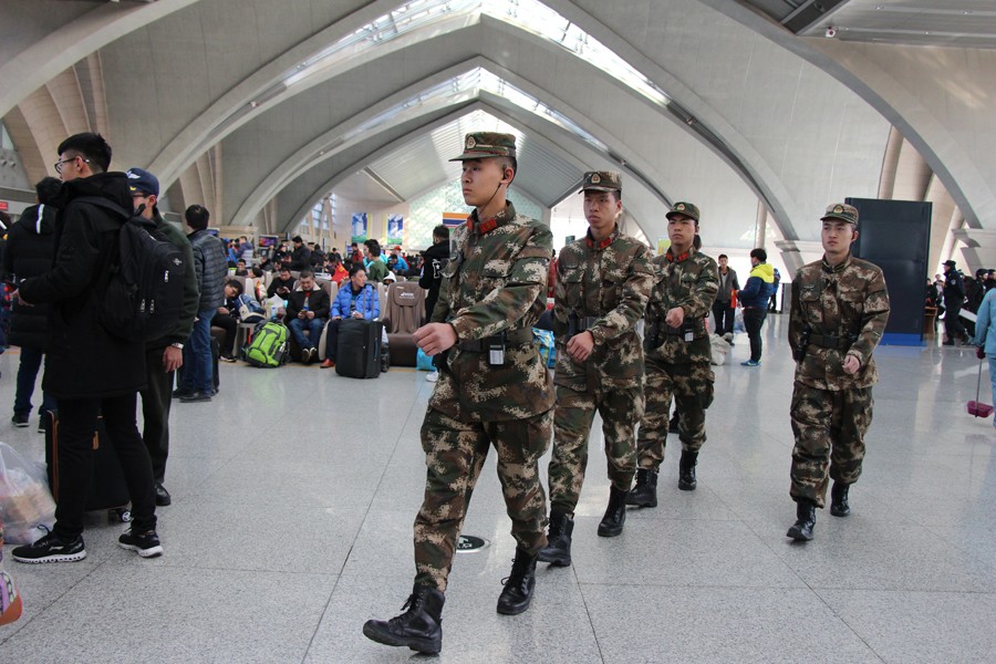 武警戰(zhàn)士在候車室內(nèi)巡邏
