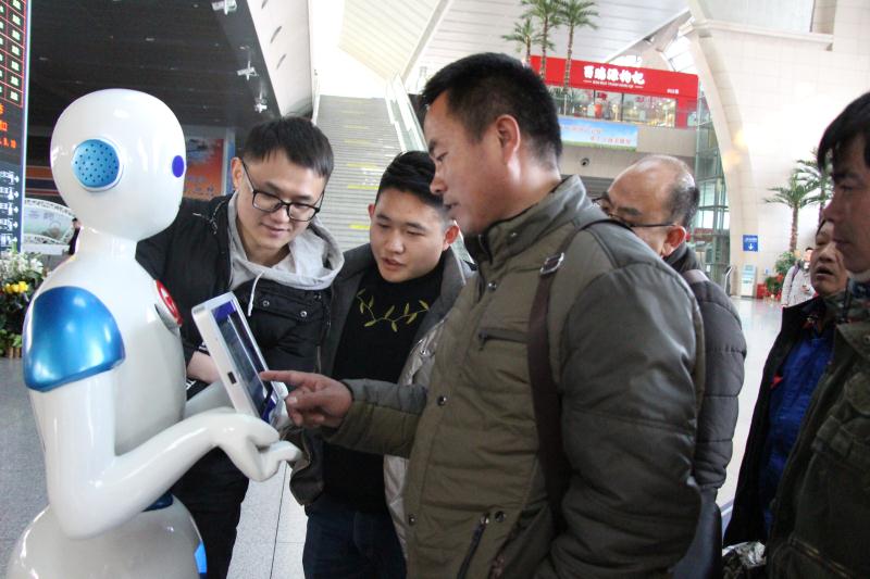 “馨家”萌萌的外形和別具一格的語(yǔ)言對(duì)答,愉悅了回家旅客的心情,旅客爭(zhēng)相與它合影留念。“馨家”大腦里清晰記憶著銀川火車站各次列車的到開時(shí)間、候車區(qū)域,還有旅行常識(shí)、天氣及銀川旅游景點(diǎn)介紹及公交出行等信息;他還具備人機(jī)對(duì)話功能,當(dāng)旅客拿著車票問(wèn)他到哪候車、洗手間怎么走的時(shí)候,他會(huì)快速的回答旅客咨詢,并引導(dǎo)旅客“走幾步”。在沒(méi)有旅客提問(wèn)的間隙,他還會(huì)為旅客唱歌。