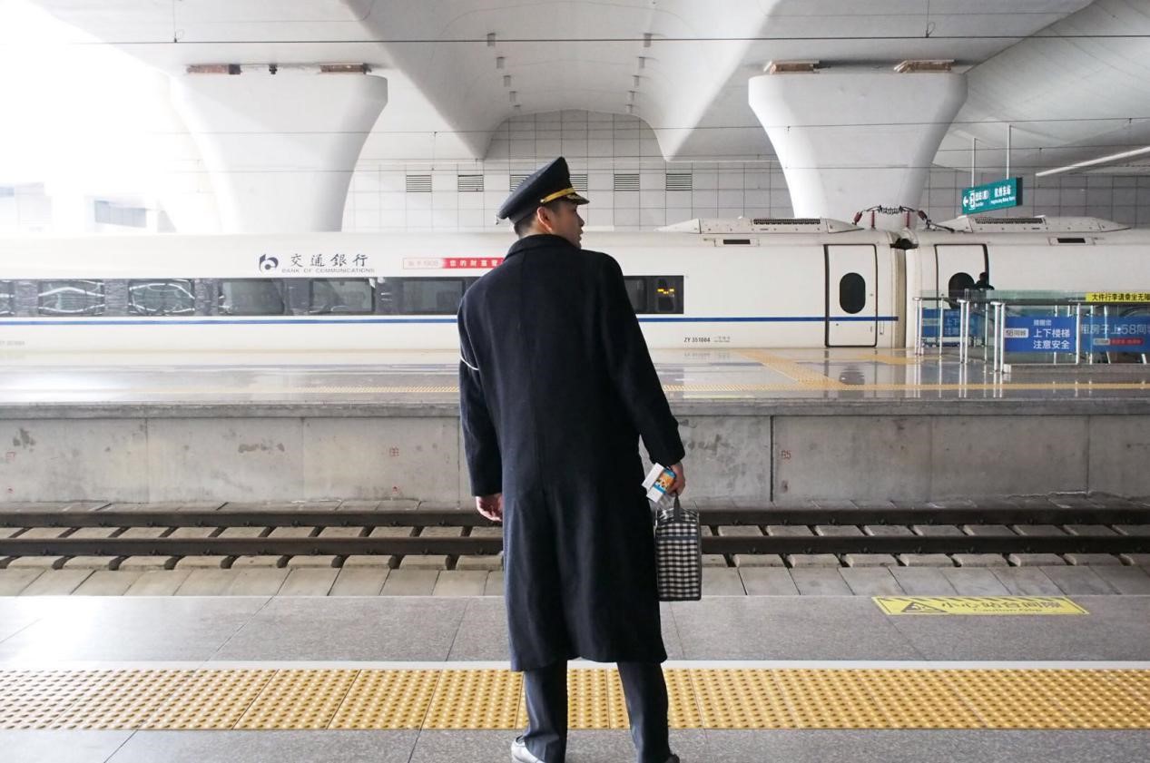 站在站臺上,他忙著維護(hù)旅客的候車秩序,時而探出頭看一眼列車駛來的方向,時而回過頭看一眼后方站臺屏上的時鐘。