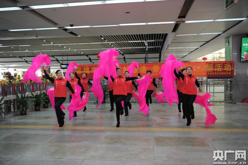 候車的旅客被這突如其來(lái)的快閃吸引過(guò)來(lái),紛紛駐足觀看,有的拿出手機(jī)、相機(jī)拍照,有的抱著小孩鉆到前面觀看,一時(shí)間,候車大廳內(nèi)熱鬧非凡。正當(dāng)旅客意猶未盡,第二個(gè)節(jié)目快速上場(chǎng),義工深情演唱歌曲《想家的時(shí)候》。優(yōu)美動(dòng)人的旋律,抒發(fā)了濃濃思鄉(xiāng)情。有些旅客情不自禁地跟著哼唱起來(lái)。歌聲剛落,義工團(tuán)隊(duì)“無(wú)縫接駁”,為旅客獻(xiàn)上了《歡聚一堂》舞蹈,渲染全場(chǎng),贏得眾人鼓掌喝彩。快閃結(jié)束后,在場(chǎng)的紅木棉志愿者、義工還給現(xiàn)場(chǎng)旅客派送福包,表達(dá)新年美好祝福!“我還是第一次看到這么好看的快閃節(jié)目,氣氛很不錯(cuò),我拍了很多照片和視頻,還拿到福包,今年我一定好運(yùn)連連。”來(lái)自湖南衡陽(yáng)的楊先生開(kāi)心不已。