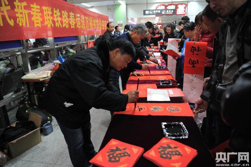 “紅桃賀歲杏迎春,丹鳳呈祥龍獻(xiàn)瑞”旅客分別拿著書(shū)法家寫給自己的對(duì)聯(lián)拍照留念,送春聯(lián)活動(dòng)現(xiàn)場(chǎng)一派喜氣洋洋。來(lái)自江西的姚女士帶著一歲多的女兒拿著紅紅火火的“福”字,高興地對(duì)記者說(shuō):“沒(méi)想到在返鄉(xiāng)的途中,還有書(shū)法家親自送春聯(lián),我心里感到特別快樂(lè)和溫暖。”來(lái)自湖南衡陽(yáng)的男孩小陳說(shuō):“我一年都沒(méi)回老家看望父母了,給父母帶一副書(shū)法家寫的對(duì)聯(lián),他們肯定喜歡。”細(xì)心的記者發(fā)現(xiàn)靦腆的小陳歡喜的明眸里竟有淚花在閃。“春滿乾坤福滿門,天增歲月人增壽”書(shū)法家很快揮毫,把新年的祝福送給小陳遠(yuǎn)方的父母。從上午9點(diǎn)至16點(diǎn),書(shū)法家們共為旅客和鐵路職工書(shū)寫、送出對(duì)聯(lián)500多幅,送出“福”字500多個(gè)。為2018年春運(yùn)旅客安全、平安、溫馨出行增添了喜慶溫暖的氣氛。
