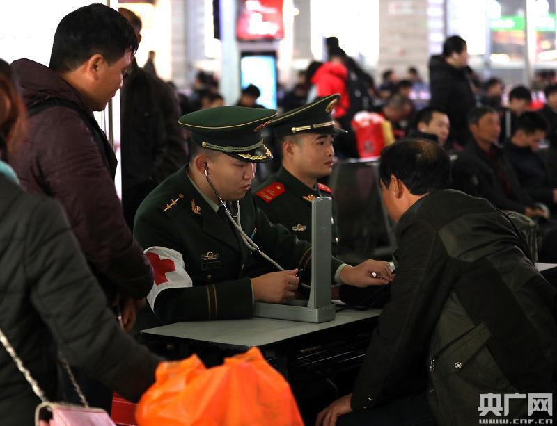 據了解,春運期間,執勤官兵在維護正常秩序的同時,為旅客群眾辦實事、解難題,開展便民服務,車站后期將以流動醫療點為主,衛生員隨巡邏官兵進行流動巡診,免費為需要幫助的旅客量血壓、發放應急藥品,受到了廣大旅客的普遍歡迎。
