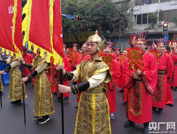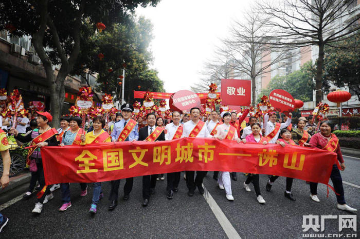 一大早,通濟橋附近熱鬧非凡,由兩千多人組成的12個巡游方陣依次排開,他們當(dāng)中既有佛山好人、大城工匠等知名人士,還有各界公益慈善力量、企業(yè)方陣、市民代表等。各個方陣內(nèi)涵豐富,嶺南醒獅、財神爺?shù)葌鹘y(tǒng)元素以及太極拳、扇子舞等大眾體育元素都包含其中,每個方陣由社會主義核心價值觀主題花燈引導(dǎo)。在行進中,巡游隊伍還不時與沿路熱情的市民互動,將風(fēng)車與紅圍巾送給市民,互致新年祝福。