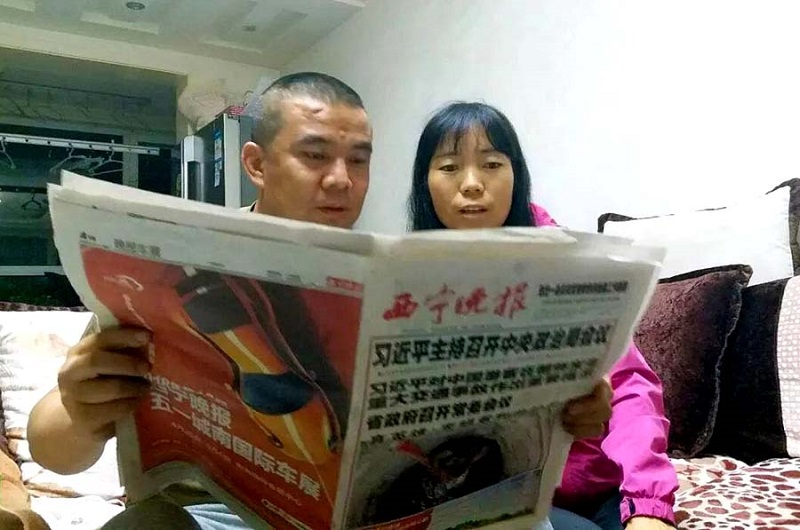 李明君和妻子王勤君再看媒體關于他們勇救兒童的報道(劉瑜攝)