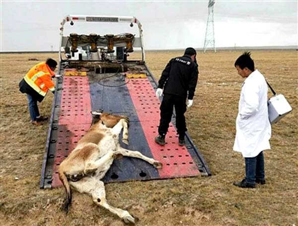 民警到達現場后,看見一只體型較為龐大、全身有紅棕色皮毛、似驢又像馬的動物躺在黃草灘上,并且動不了,但有明顯生命跡象。經初步鑒定為國家一級保護動物西藏野驢,由于頸部被撞傷,不能站立。民警在確定傷情后,制定救助方案,雇用板車將其運回距離現場480公里外格爾木市野生動物救助站進行救治。