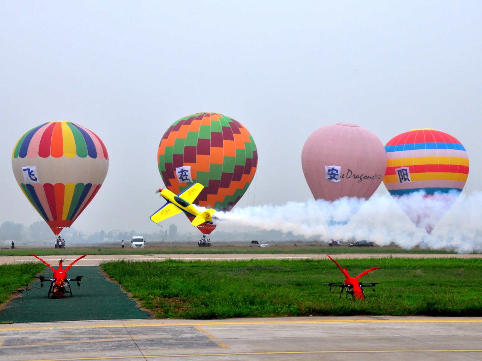 開幕式結束后,滑翔傘、滑翔機、直升機依次亮相,25名跳傘隊員攜帶各國國旗演繹“仙女下凡”,特技飛機時而“打滾撒歡”,時而“一飛沖天”,時而“孔雀開屏”……看得與會的數千名嘉賓和群眾眼花繚亂。據了解,當天有 15架特技飛機、6架R-22直升機、10具熱氣球、30具動力傘編隊、20架無人機,相繼亮相,共同為全場游客演繹飛行傳奇。