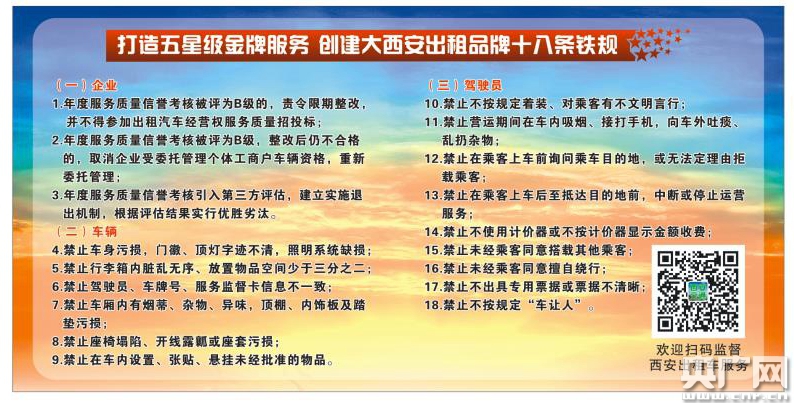 央廣網(wǎng)西安7月30日消息(記者黃立新 溫超 舒隆煥)今年7月12日,西安市交通運輸局印發(fā)《打造五星級金牌服務(wù)創(chuàng)建大西安出租品牌十八條鐵規(guī)》,對出租車公司、駕駛員、出租車立下了新的“規(guī)矩”,被民間稱作出租車行業(yè)新“18條”,和北京、上海、武漢等城市的出租車管理規(guī)定相比,西安市的新“18條”有的是重申,有的是具體化,都是門檻級、ABC階段的約束,不過是剛剛有了幾分管理的硬氣。