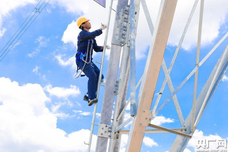 烈日高溫下,南方電網廣東云浮供電局員工正專注地進行接線,確保用戶正常用電。(央廣網發 周燊平 攝)