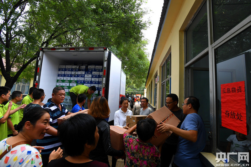 28日上午,貨車拉著救援物資先來到了紀臺鎮救援物資接收點,記者在現場看到,偌大的院子里已經堆積了不少的救援物資,愛心企業還為紀臺鎮送來了一臺大功率排污泵。(央廣網發 通訊員劉延珉 攝)