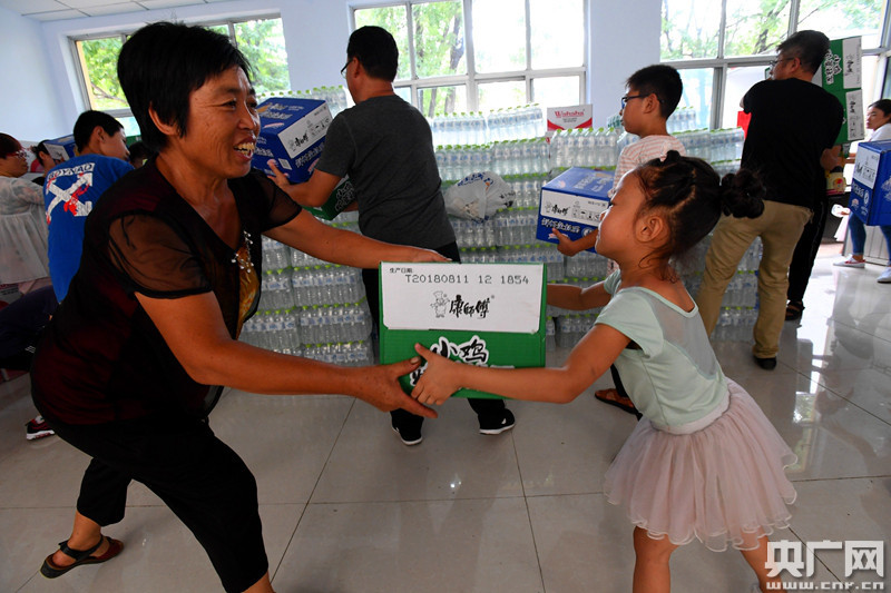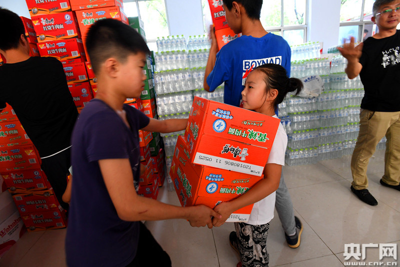 在搬運過程中,記者注意到眾多志愿者中“藏著”幾個小小的身影,他們跟大人一樣忙里忙外,他們搬不動成箱的礦泉水,于是就選擇比較輕的方便面,等一車物資搬運結束,他們的臉上也都布滿了汗珠。(央廣網發 通訊員劉延珉 攝)