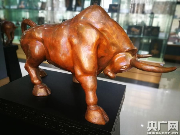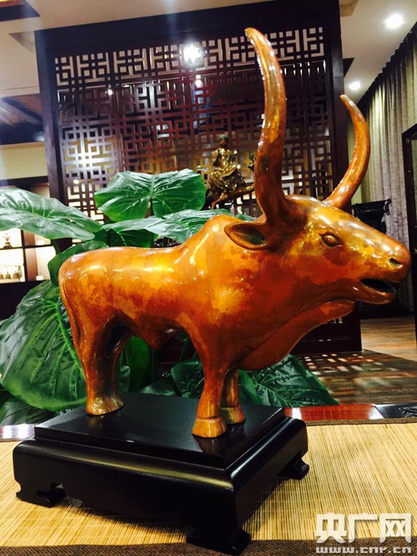 在珍品館里,土金勇向記者介紹了五件特殊的作品——孔雀明王、孔雀瓶、五型爐、仿古牛和大犀牛。可惜,記者目前無緣在此看到原品。因為早在1986年,國家輕工部就將這五件云南斑銅定為“工藝美術珍品”,將它們收藏于中國工藝美術館。1997年香港回歸時,由昆明市斑銅廠承制的“吉祥孔雀瓶”作為云南政府賀禮贈送香港特區,獲得香港同胞和業界的高度贊譽。而大犀牛等作品又被作為國禮漂洋過海贈給了外國元首。