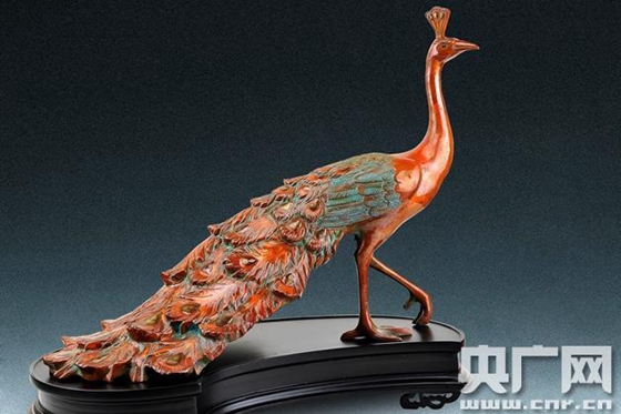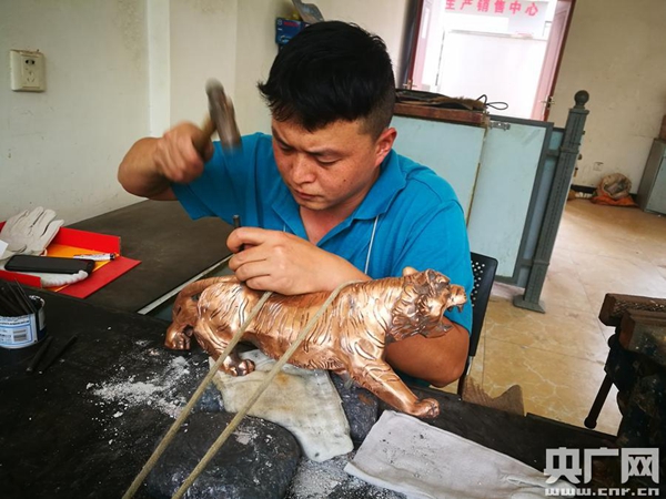 那時,廠區有兩位師傅正分別制作一虎、一馬兩件作品。特別是制虎的那邊,古銅色的虎軀被麻繩固定起來經受鏨刻鍛打,而微微回轉的虎首正睥睨著師傅,仿佛它立刻便能掙脫束縛,回歸山林。在還是頗為粗陋的銅坯上,力的曲線和動感已在流淌,藝術的生命呼之欲出。土金勇告訴記者,銅本身是冰冷的,但以廠里工藝大師制作的懸崖孔雀為代表,生動甚至夸張的造型、光影色調的巧妙搭配賦予了作品更多個性與溫度,這是其它金屬工藝無法比擬的。