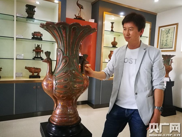 國家級非物質文化遺產斑銅技藝傳承人、云南省金屬工藝大師土金勇(央廣網記者 李健飛 攝)