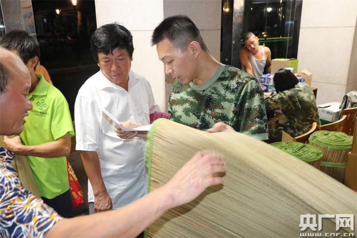 圖為深圳邊防支隊官兵向避險群眾派發涼席(央廣網發 林國浩 攝)