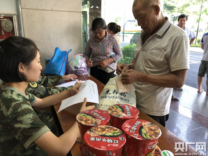 圖為深圳邊防支隊官兵向避險群眾派發食物(央廣網發 林國浩 攝)