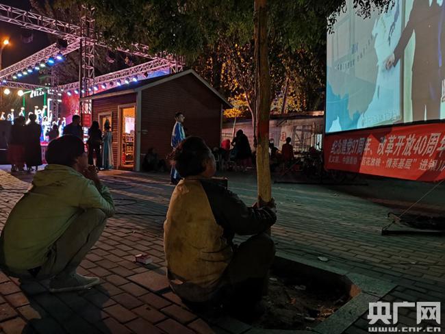 每晚7點后,放映點前及路邊停滿了電動三輪車、共享單車和一些滿懷興趣的觀眾。其中,既有歸家途中的打工者,也有晚飯后鍛煉身體的居民,或倚靠著樹、或蹲在地上、或找個塑料凳子看電影。最熱鬧的時候,能聚集個二、三百號人,最少也有幾十個觀眾駐足觀看。