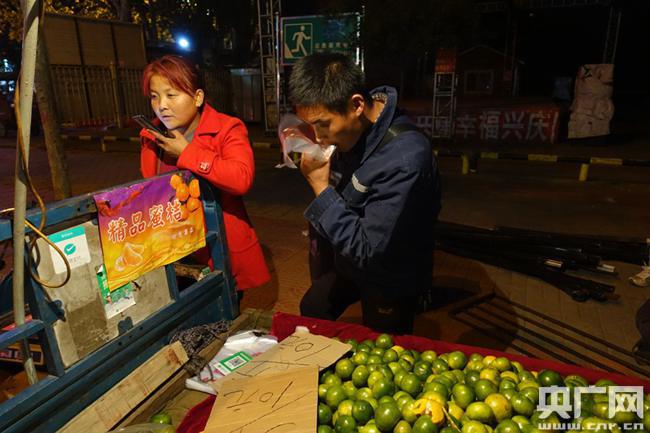 魏文軍用牙齒撕開塑料袋賣水果。(央廣網記者 徐升 攝)