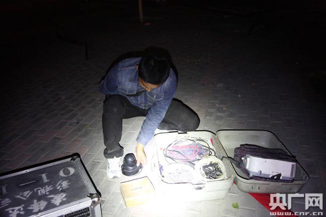 魏文軍借著手電筒的燈光整理放映設備。(央廣網記者 徐升 攝)