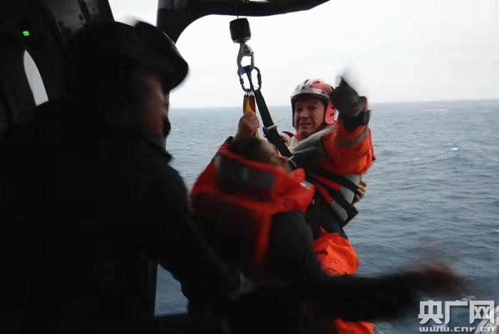遇險(xiǎn)船員被救助直升機(jī)救起(央廣網(wǎng)發(fā) 廣東海事局宣傳處供圖)