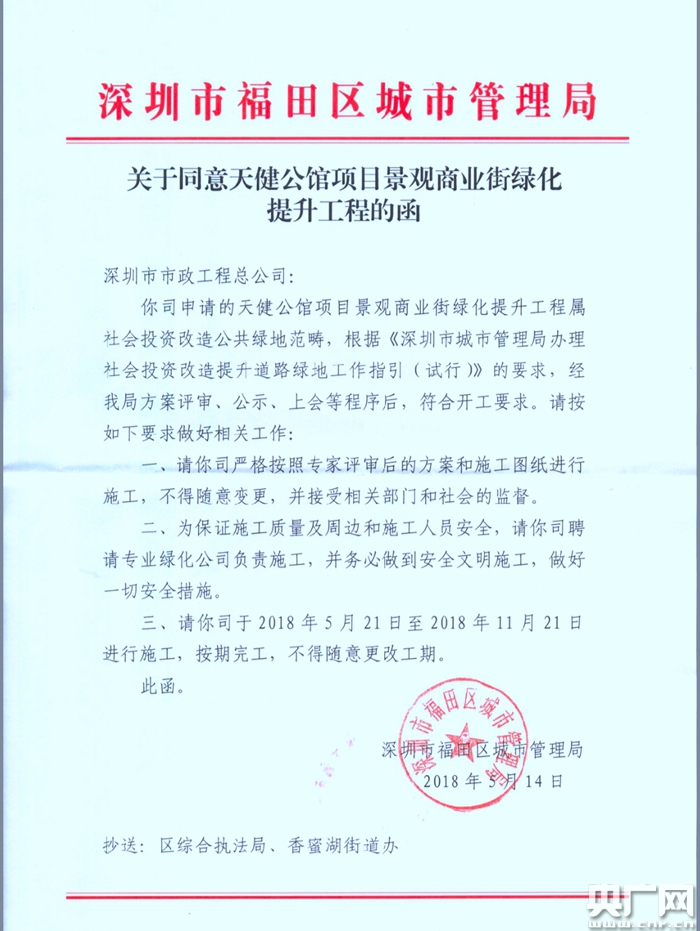 記者發現,按照深圳市交通運輸委員會7月19日頒發的深圳市占用挖掘道路許可證中明確,天健公館人行道景觀提升工程的使用時間是截止到11月19日。深圳福田區城市管理局的批復函中施工日期截止日是11月21日。