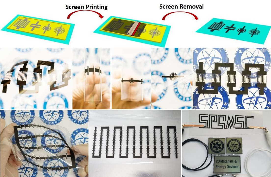 在該工作中,研究人員首先開發了一種具有優異流變學和電化學性能的石墨烯導電油墨,然后采用絲網印刷的方法,實現了平面型、集成化微型超級電容器的制備。該制備過程采用一步法實現,大大簡化了制作流程,顯著提高了集成器件的整體性和機械柔韌性。此外,根據不同的實際應用需求,該方法不僅可以對集成化微型超級電容器的形狀和大小進行有效調控,而且能夠通過對微型超級電容器任意串并聯集成,滿足不同的輸出電壓和電流的要求。例如,將130個單器件串聯得到的微型超級電容器模塊,可實現100 V以上的高輸出電壓。
