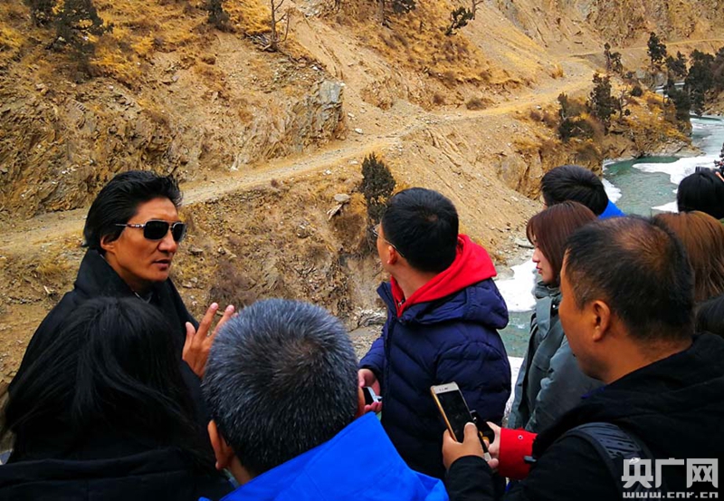 雪山鄉(xiāng)鄉(xiāng)長旦正才讓在現(xiàn)場介紹當(dāng)年修公路的情形(央廣網(wǎng)記者 張雷 攝)