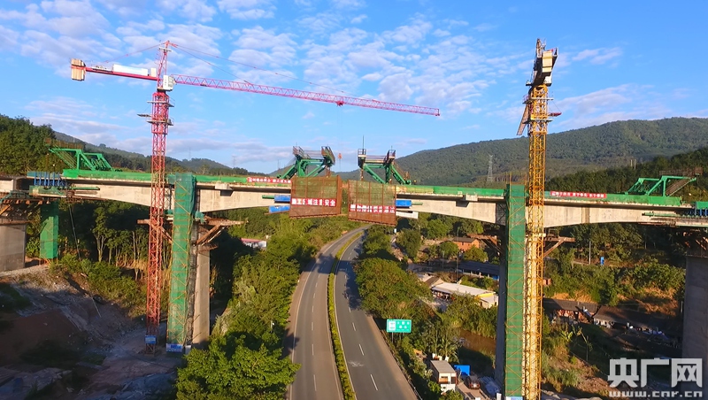 玉磨鐵路“一橋跨兩路”的關坪雙線大橋合龍。央廣網發 沈濤攝影
