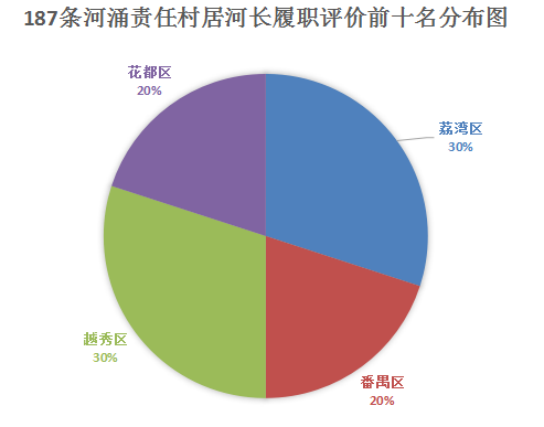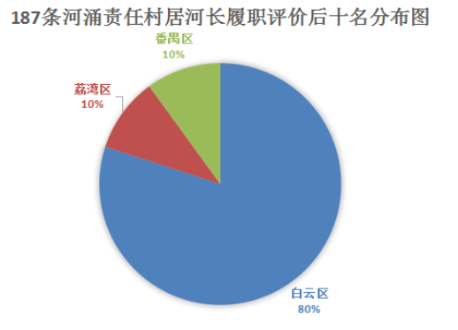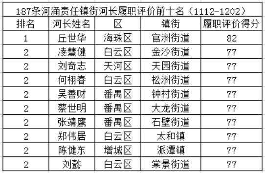 廣州市河長辦每半個多月發布一期河長管理簡報,對全市河長的履職情況進行統計和評價,以督促各級河長認真履職。簡報對187條河涌的鎮街級河長和村居級河長履職情況進行評分,公布分數最高的十名和最低的后十名河長名單。