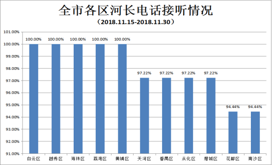 此外,11月19日至12月2日,全市村(居)級河長“四個查清”完成率緩慢上升,為20.43%,大部分河長未能按要求完成內容巡河工作,其中越秀區提升較明顯,完成率達到100%;南沙區(4.65%)、從化區(4.80%)、花都區(8.33%)、黃埔區(9.52%)、白云區(10.00%)四個查清完成情況較差。特別是南沙區,沒有明顯改善,而且有下降趨勢。2017年9月9日至2018年12月2日,河長APP問題各區辦結率達到89.89%,其中白云區(83.41%)、番禺區(84.71%)、海珠區(84.79%)辦結情況滯后。11月15日至11月30日,市河長辦抽查了全市區、鎮(街)、村(居)級河長電話接聽情況共388人次,共有6位村居級河長未接聽電話。其中南沙區和花都區接聽率(94.44%),增城區、從化區、番禺區、天河區接聽率(97.22%),其余各區接聽率則是(100%)。