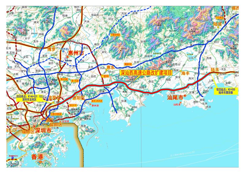深汕西高速公路改擴建項目全長約 146.6公里,路線起于陸豐市潭西鎮(zhèn),順接深汕東高速公路,沿現(xiàn)有高速公路走向,經(jīng)汕尾市、深汕特別合作區(qū),惠州市,終于深圳市龍崗區(qū),順接惠鹽高速公路深圳段。