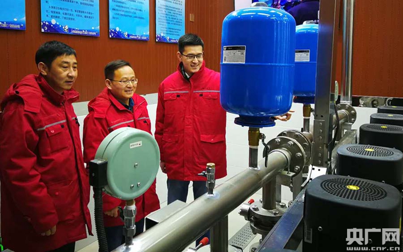 西寧供水集團公司二次供水管理部部長李文鵬等巡視海晏花園二次供水新設備運行情況(央廣網記者 張雷 攝)