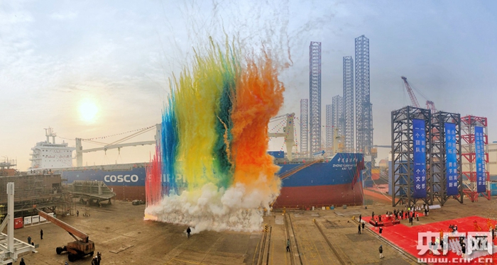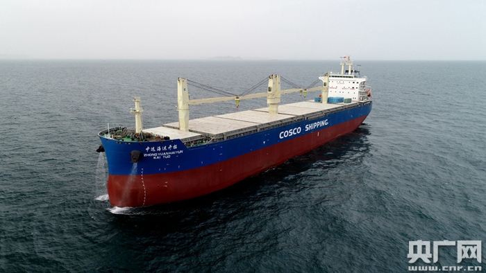 大連中遠(yuǎn)海運重工設(shè)計建造的多用途紙漿船“中遠(yuǎn)海運開拓”輪命名交付(央廣網(wǎng)發(fā) 張善殊 白俊 攝)
