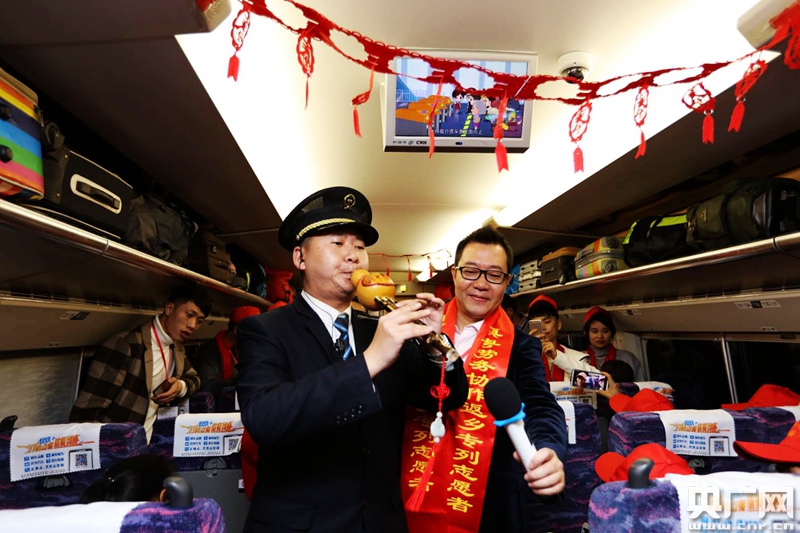 動車內(nèi),張燈結(jié)彩,紅艷的中國結(jié)、窗花和福字,把車廂烘托出濃濃的年味。一路滿懷暖意,一路歡聲笑語。列車上精心準(zhǔn)備了歌舞、有獎競猜、送福送春聯(lián)、過生日等暖心互動節(jié)目,讓務(wù)工人員回家旅途充滿溫馨。