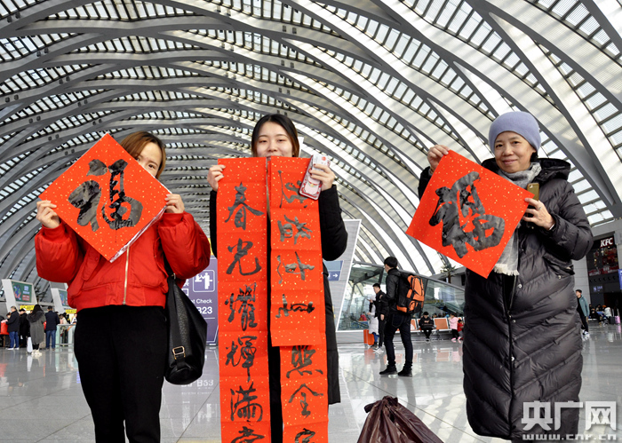 活動現場,候車旅客拿著一幅幅新春對聯和大福字喜笑顏開,紛紛通過微信、電話等方式向家人和朋友提前傳遞著新年的信息,并稱贊車站服務旅客的好舉措。活動營造了文明祥和、溫馨和諧的節日氣氛,展示了高鐵車站優質服務形象,體現了“三個春運”的服務理念。
