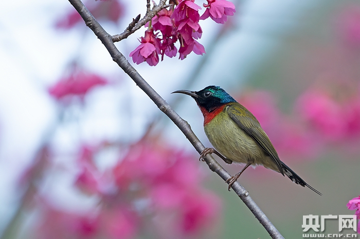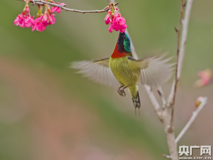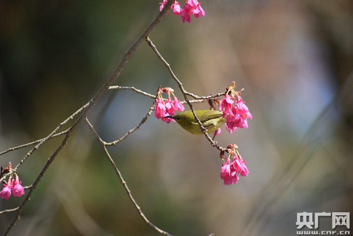 央廣網福州1月30日消息(記者張子亞)眼下,各種櫻花正在福建各地漸次絢爛綻放。花叢間,偶爾響起幾聲細碎鳥鳴,幾只僅有食指大小的纖弱小鳥在枝頭上下翻飛吸食花蜜,或倒轉金勾,或振翅懸停。粉色、赭紅、金屬綠、橄欖黃……花與鳥的明艷色彩構成一幅流動的美麗花鳥圖。每天,在福州森林公園櫻花園附近的水池邊,這樣的畫面都會謀殺無數長槍短炮的內存。