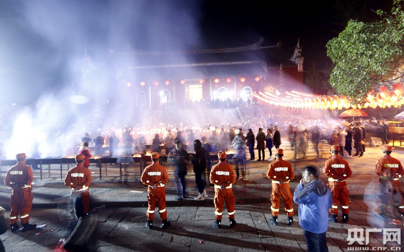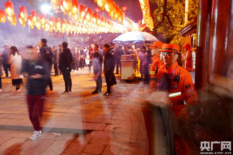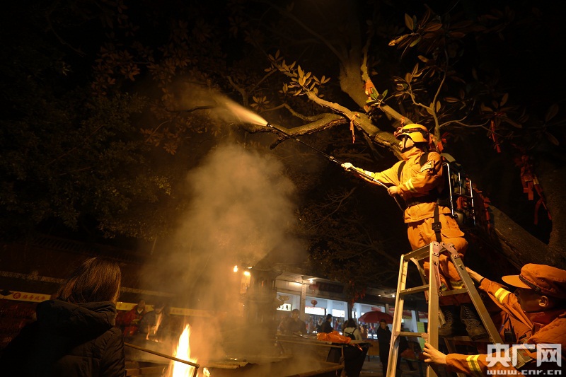 隨著時間推移,接近凌晨前來祈福的市民也越來越多。“森林消防員同志,在大殿右香爐上方樹枝被火苗燎燃,請快速處理。”發現險情后,涌泉寺工作人員立即向巡邏小分隊請求支援,班長楊進忠帶領四名隊員背上細水霧滅火機僅用五分鐘成功處置。
