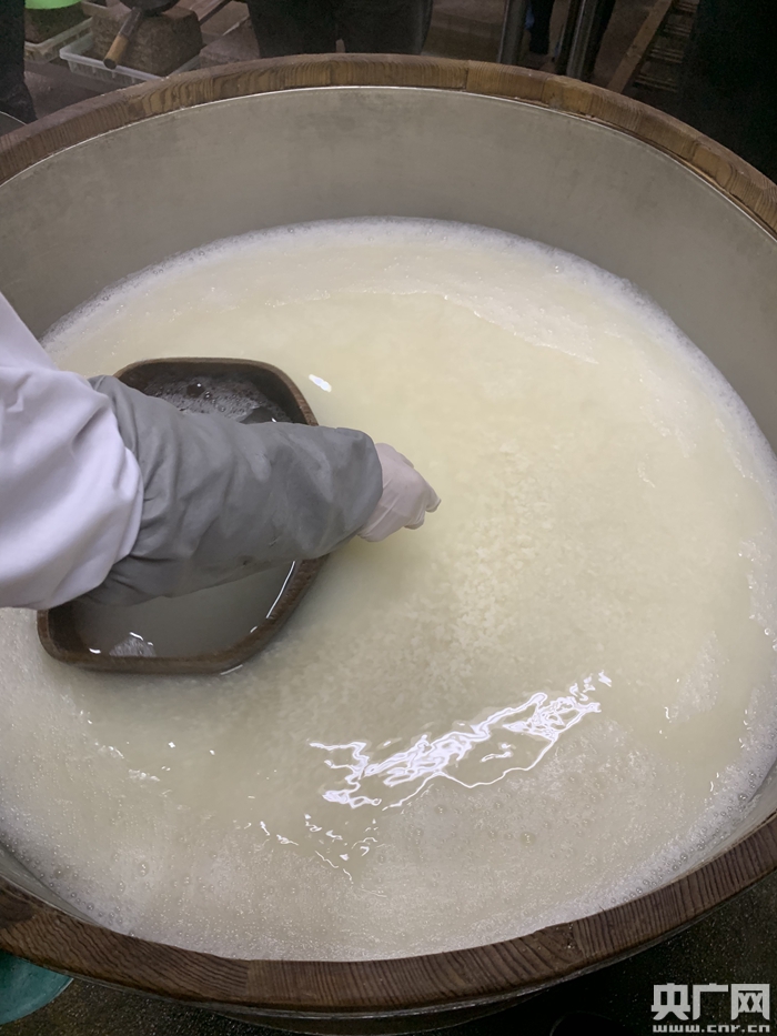 在位于上清溪旁的游客豆腐文化體驗館里,陳小輝的女徒弟正在點鹵游漿,在一個直徑約一米的大木桶里,乘著熱騰騰的豆漿,只見這位女徒弟用一個木鏟在木桶一遍遍地轉動著,陳小輝說,這是制作過程中最重要的一環,決定著豆腐的口感。