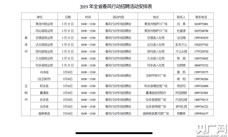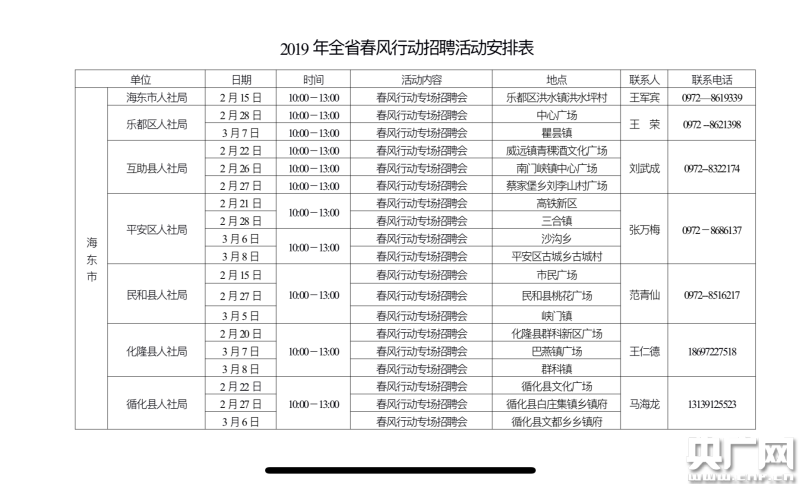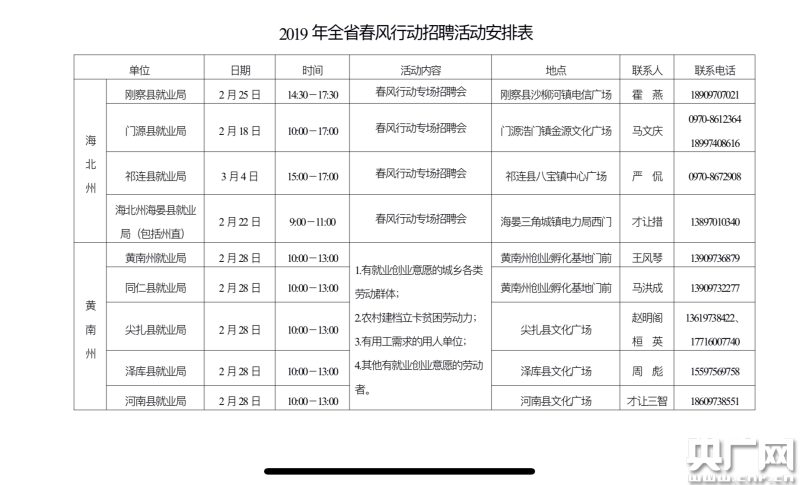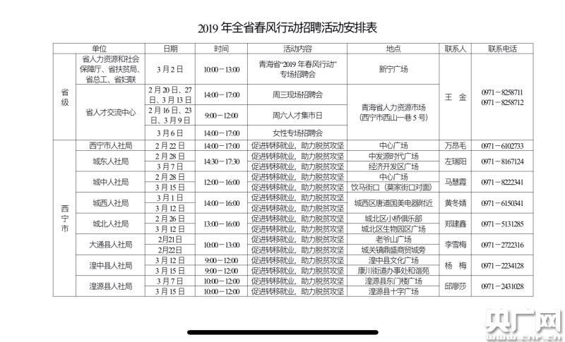 央廣網西寧2月18日消息(記者劉澤耕 通訊員張碧霞)記者18日從青海省就業服務局了解到,青海省人力資源和社會保障廳、省扶貧開發局、省總工會、省婦女聯合會定于2019年2月中旬至3月中旬在青海省組織開展以“促進轉移就業,助力脫貧攻堅”為主題的“2019年春風行動”專項活動。