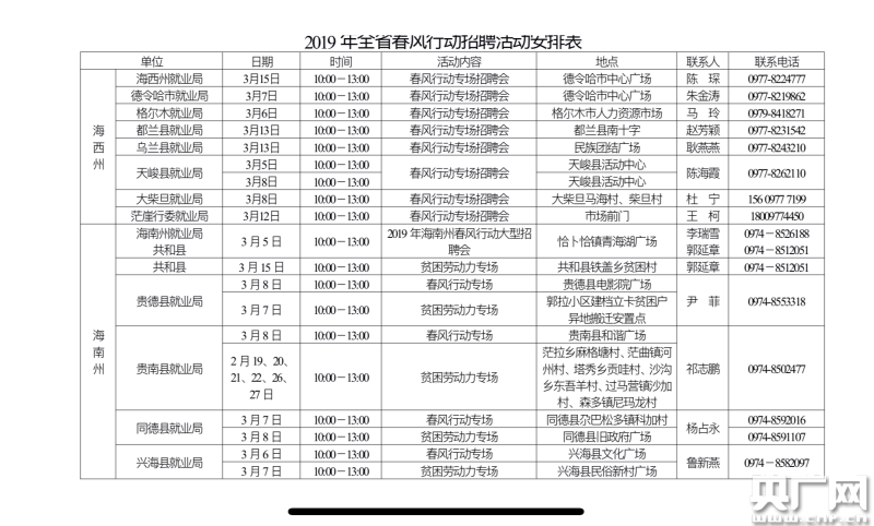 青海省內兩市六州將于3月中旬前在當地舉辦“春風行動行動專場”、“貧困勞動力專場”等多場招聘會,廣大求職者及用人單位可踴躍參加。