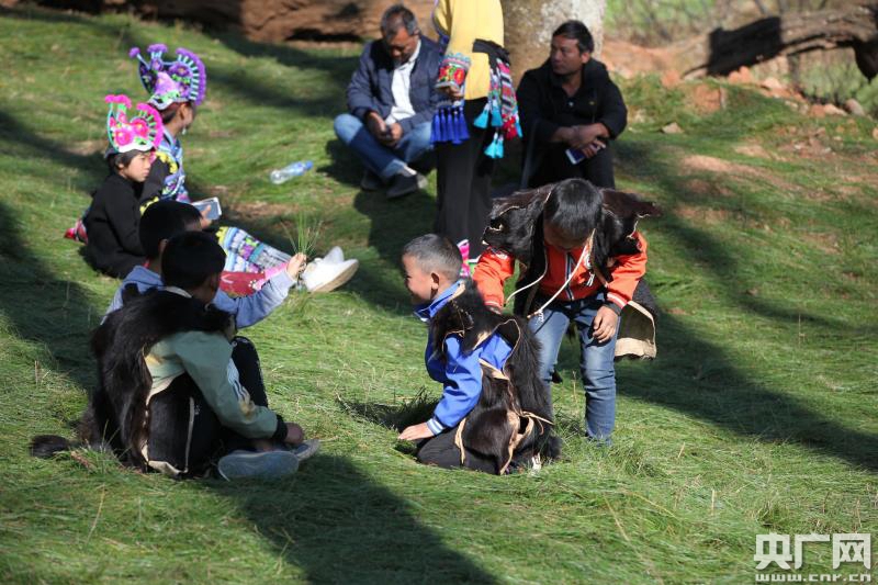 賽裝節一開始就有比賽的性質,這可謂是最早的時裝表演,更是表演中的“時裝模特”。在畢摩老人為賽裝節順利舉行完虔誠的祭祀后,各年齡層次的賽裝隊伍手挽手在蘆笙的伴奏中依次上場。