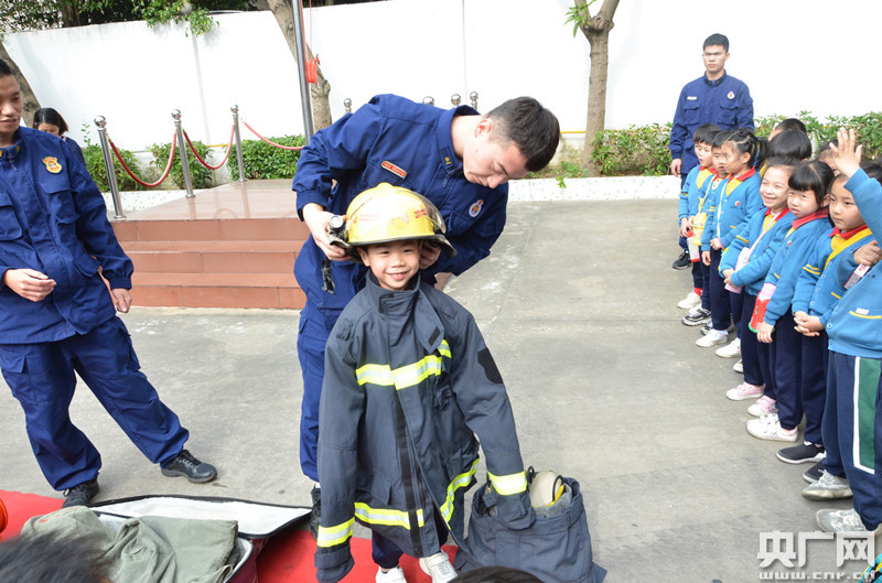 小朋友們進行消防服穿著體驗。通訊員供圖