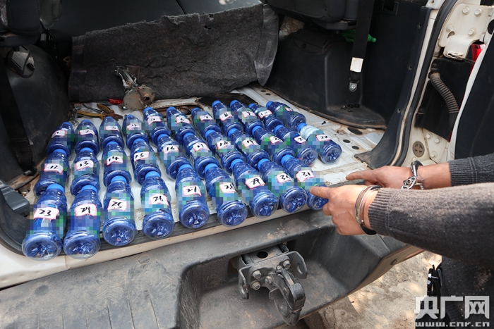 3月9日12時(shí)許,該支隊(duì)軍賽邊境檢查站執(zhí)勤民警在查緝現(xiàn)場對一輛從孟定開往臨滄方向的越野車進(jìn)行例行檢查時(shí),發(fā)現(xiàn)該車駕車男子面對詢問神情恍惚、十分緊張,且答非所問,男子的一系列行為引起了執(zhí)勤民警的高度警覺。執(zhí)勤民警遂將該車引導(dǎo)至重點(diǎn)檢查區(qū)域進(jìn)行詳細(xì)檢查,經(jīng)檢查發(fā)現(xiàn)該車后備箱內(nèi)螺絲有擰動(dòng)的痕跡,通過仔細(xì)拆裝檢查,當(dāng)場從該車油箱內(nèi)查獲用藍(lán)色飲料瓶散裝的毒品甲基苯丙胺(冰毒)31瓶,共計(jì)9.49公斤,犯罪嫌疑人被當(dāng)場抓獲。