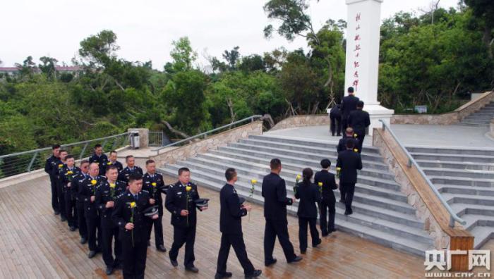 上午10時(shí)許,萬山邊檢站的移民警察手持菊花,神情凝重地敬獻(xiàn)在桂山艦烈士紀(jì)念碑前,并通過列隊(duì)肅目、鞠躬、默哀,深切緬懷烈士的光輝業(yè)績,追思他們英勇頑強(qiáng)、不怕犧牲、無私奉獻(xiàn)、忠誠為民的革命精神。