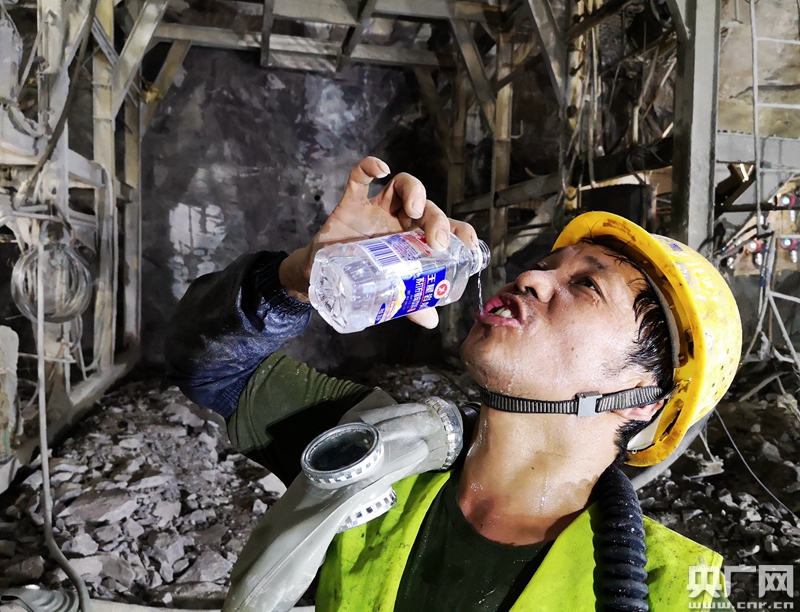 施工人員休息期間喝水解渴(央廣網發 張偉明 攝)