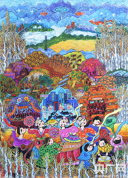 據(jù)了解,此次現(xiàn)場展出的300幅農(nóng)民畫作品,全部以美麗鄉(xiāng)村為主題。既有大視角、大手筆呈現(xiàn)改革開放40年來“三農(nóng)”的發(fā)展變化和輝煌成就的,也有多角度、小場景展示農(nóng)民生產(chǎn)、生活提高和共享改革開放豐碩成果的。作品不僅彰顯了地域文化、民族文化、民俗文化,也勾勒出了祖國70年的巨變。樺甸市文化館副館長康梅花向記者介紹稱,這些作品展示了美麗的新農(nóng)村、新農(nóng)民、新畫家的精神風貌,通過這個活動給全國的農(nóng)民畫家搭建了一個藝術交流、切磋技藝和展示的平臺。
