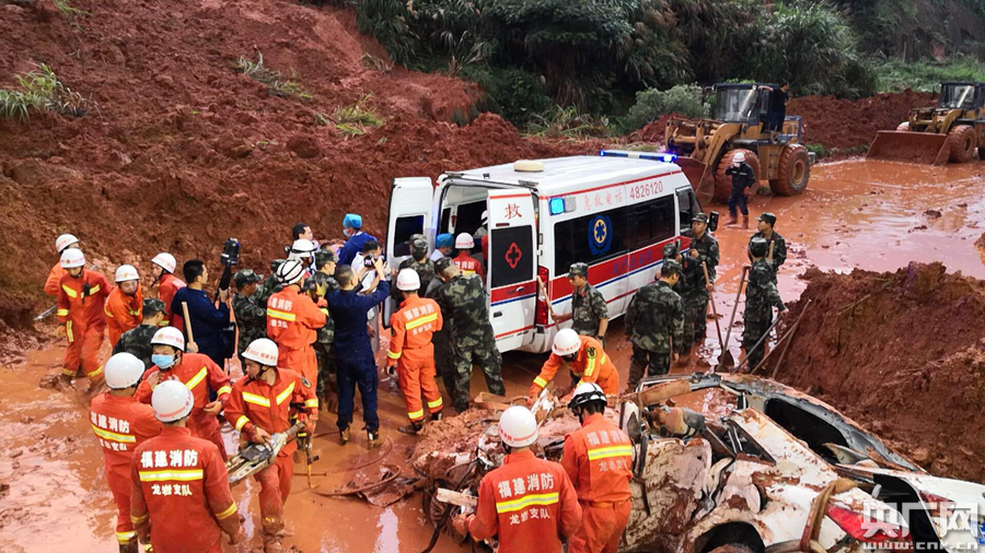 13日下午16:09,福建省龍巖市武平縣平川街道東門市場西南方向小山坡因近日持續強降雨(過程雨量達242毫米),雨水飽和突發局部山體滑坡,導致道路交通中斷,路邊臨時停放的多部車輛被掩埋,武警福建總隊龍巖支隊接到情況后,立即派出官兵,趕往事發地點,全力組織現場處置救援。截止當日晚19:45,經過3個多小時全面緊張排查搜救,現場發現一名男子被困車中,救出后經醫務人員現場緊急搶救無效死亡。